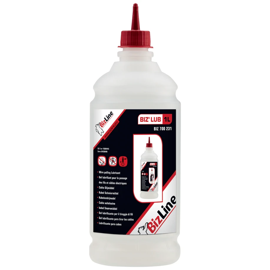 BIZ’LUB lubricant gel for cable and wires to ease passage of cables and wires through electrical conduits, ducts and pipes. Plus points: non-toxic and non-flammable. Can be applied to both high- and low-voltage cables. · · · Ph neutral (6.5 ± 0.5). · · Operating temperature: -5 °C to +82 °C (freezes at -5 °C). · · Storage temperature: +4 °C to +40 °C. · · Density: 1.010 ± 0.01 g/ml. · · Viscosity: 3400 ± 200 cps. · · Dry residue: 12 °C. · · Volume: 1 l. · · To ease passage of cables and wires through electrical conduits, ducts and pipes.