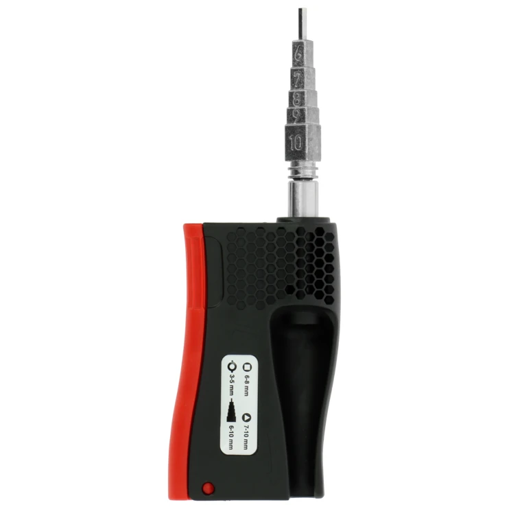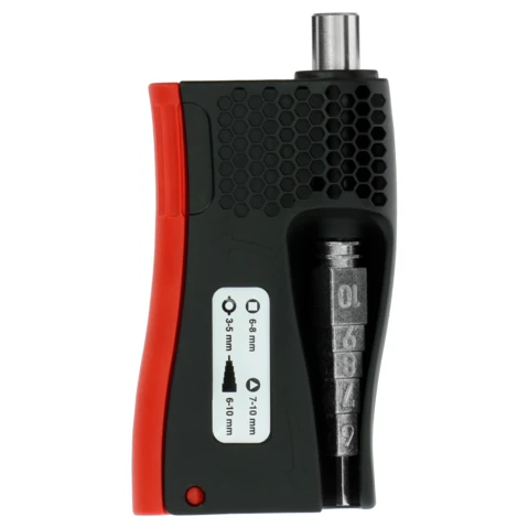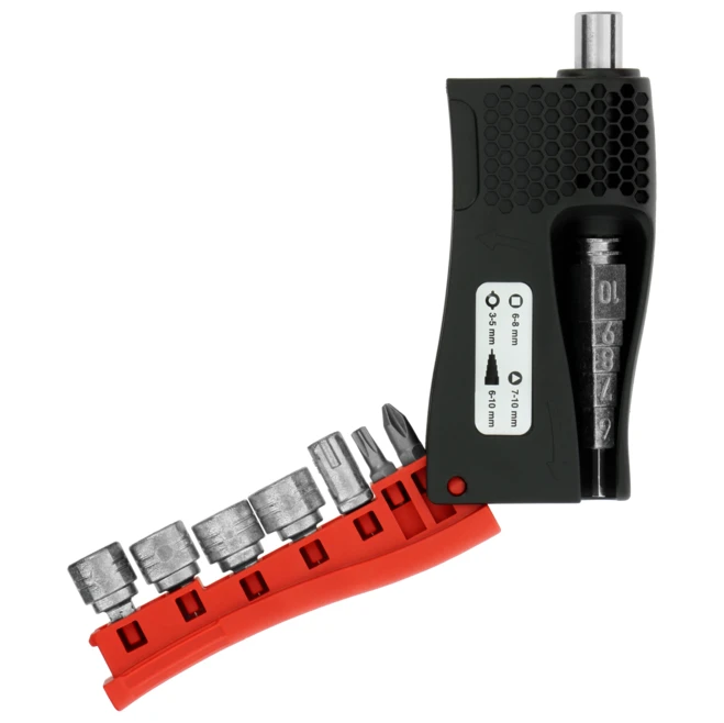 Universal cabinet key box. 20 sockets in one single tool! Compact and multi-purpose (gas and water maintenance, air conditioning, ventilation, heating, sanitation, etc.). · · · Ergonomic box in high strength plastic · · Die-cast zinc inserts · · Direct reading of dimensions on each key · · Consists of: · · Square (6/7/8 mm) · · Triangular (7/8/9/10 mm) · · Bit-key (3-5 mm) · · Hexagonal 1/4 for end caps · · Reversible bit for 1.0 x 7 mm slotted screws and Philips PH2 · · Reversible bit Torx TX20 and TX25