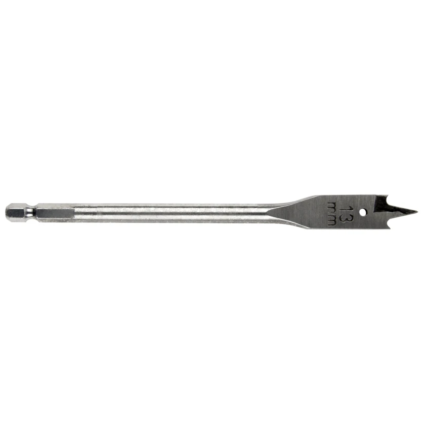 Flat wood drill bit 13 x 152 mm perfectly suited for drilling hard and soft wood types. Hexagonal fitting. Plus points: sharpened tips and points for accurate drilling dimensions. · · · Hexagonal shank. · · Ideal for drilling hard and soft wood.