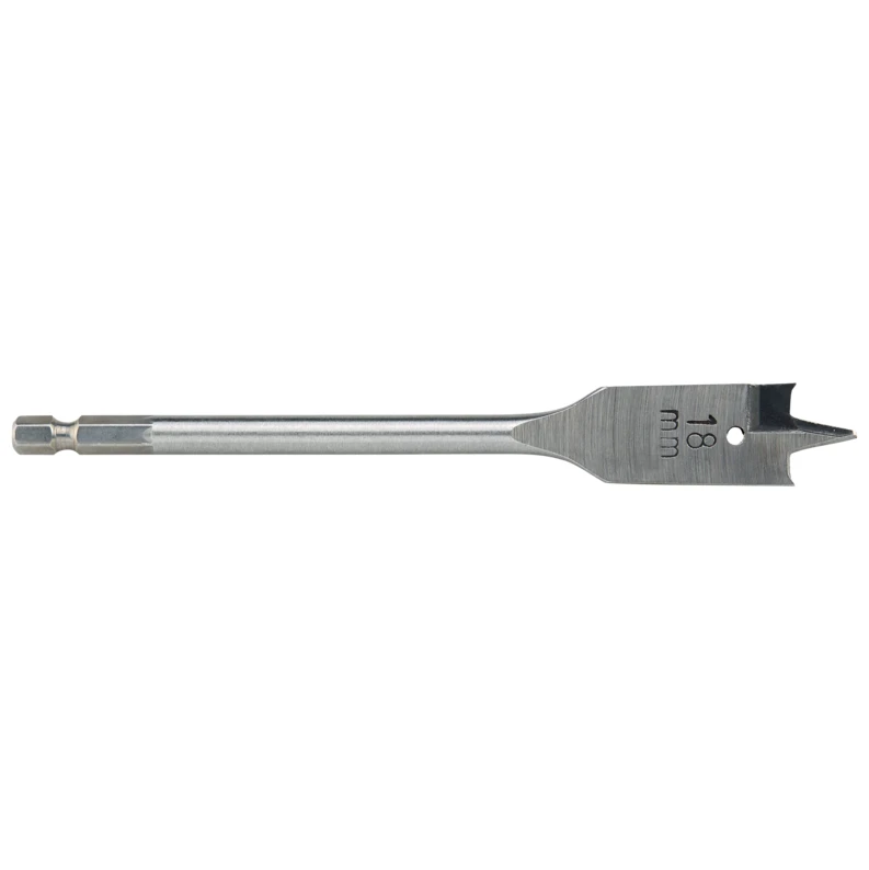 Flat wood drill bit 18 x 152 mm perfectly suited for drilling hard and soft wood types. Hexagonal fitting. Plus points: sharpened tips and points for accurate drilling dimensions. · · · Hexagonal shank. · · Ideal for drilling hard and soft wood.
