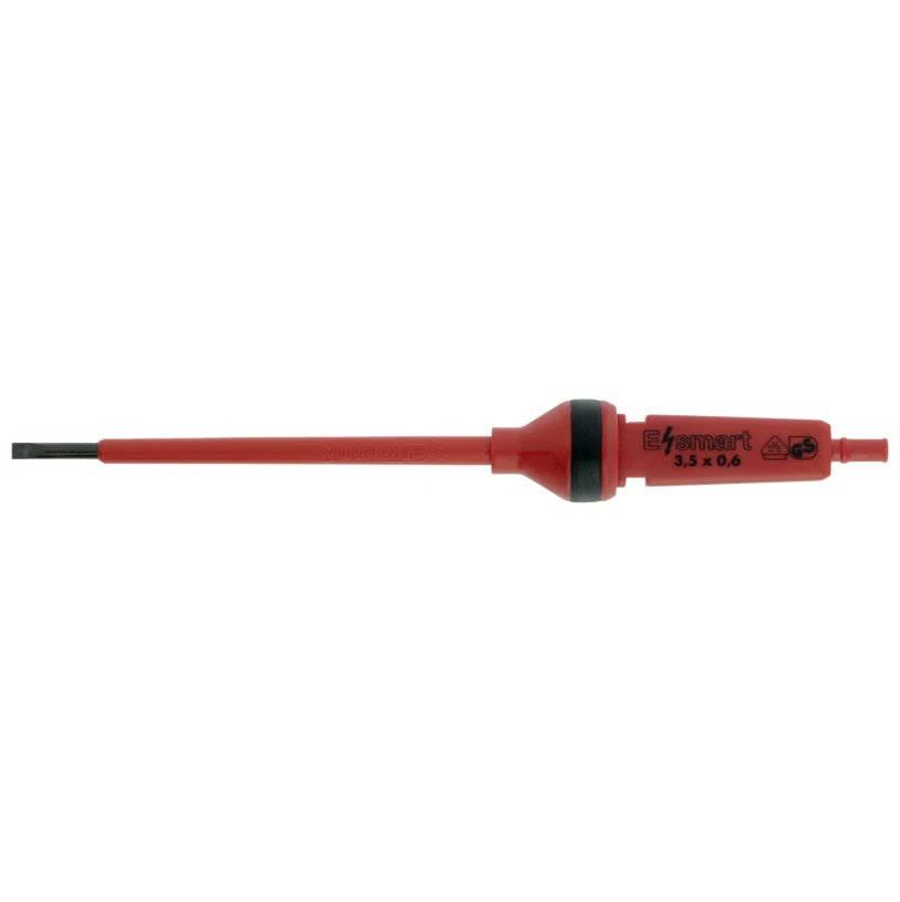 Technical Specifications  Technical Specifications Screwdriver for slot head screws Grip design 1-component Square drive/hexagon drive None Model Straight Type of shaft Round Blade diameter 5 mm Blade width 3.5 mm Blade thickness 0.6 mm Clamp feature No Square drive/hexagon drive over the whole blade No Bulged blade No Continuous blade No With anti-roll protection No With striking cap No Total length 174 mm Blade length 100 mm Cap rotatable No Low spark model No Precision model No VDE tested Yes Antimagnetic No Isolation protection 1000 V Yes Insulated Yes · Technical Data Sheet – Click to Download