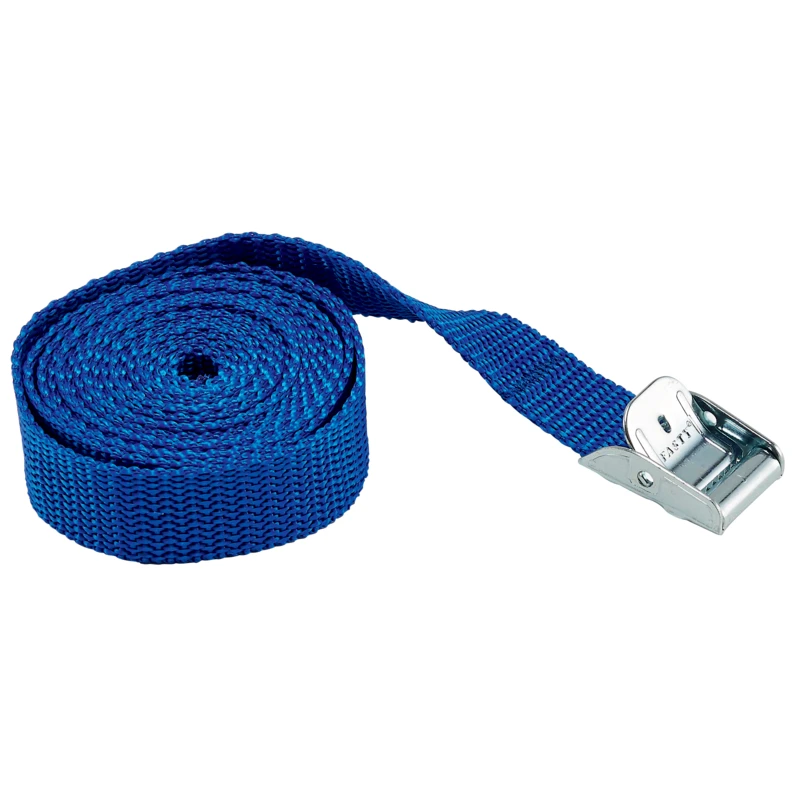 2 m x 20 mm blue polypropylene strap with buckle with breaking load of 300 kg ideal for strapping and securing light loads. · · · Polypropylene. · · For strapping and stowing light loads on trailers, galleries, etc.