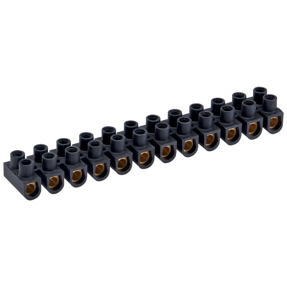 12-way black polypropylene 10 mm² terminal blocks, sold with screws engaged at 1/3. Ultra-flexible, the blocks can be separated with 1.5 turns without the use of tools. NF compliant. · · · 12-way polypropylene connector strips. · · Supplied with screws engaged at 1/3. · · Glow wire test: 960 °C.