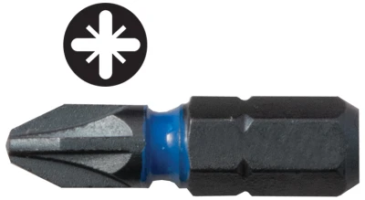 A Pozidriv screwdriver bit with a PZ1 tip and a 25mm overall length. It is made from high-quality steel and features a black oxide finish for corrosion resistance. The T4560 PZ1D is designed for use with impact drivers and is ideal for driving Pozidriv screws in a variety of materials. It is also suitable for use with hand screwdrivers. · · · Manufactured from specially formulated V8 steel alloy for extreme toughness · · Features torsion control technology to withstand the stresses of high torque applications · · Blue steel impact bits provide a vastly extended working life · · Colour coded for convenience