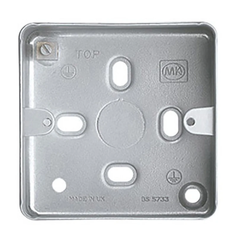 The MK K829ALM is an Aluminium, 1 Gang, 38mm deep Surface mounted back box. It has a brass Earth terminal and a knockout on the base. It is not suitable for mounting Grid Plus modules or modular data/telecom modules. All boxes are fitted with a brass earth terminal and base knockout. These boxes are not suitable for mounting Grid Plus modules or modular data/telecom modules. The MK Metalclad Plus Range is made from heavy gauge steel making it a very tough set of products. This means they are ideal use in factories, workshops, garages and sheds. · · · No. of gangs 1 · · Plain box with no knockouts · · Lug Type Fixed · · Mounting type Surface · · With Earth Terminal
