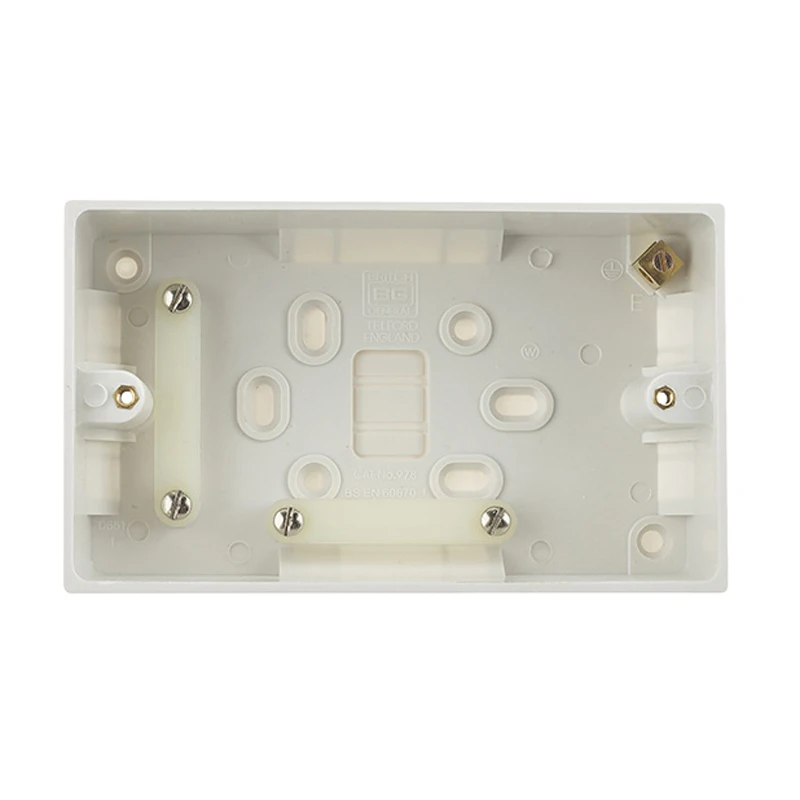 BG Surface Box offers a standard range of white moulded wall accessories offering superb quality and exceptional value suitable for domestic or commercial installations. Features cord grip adjacent to bottom knockout, alternative position for when the box is mounted vertically. · · · Standard design suitable for domestic or commercial installations · · Fitted with earth terminal as standard · · Multiple knockouts and fixing holes · · Cord grip adjacent to bottom knockout, alternative position for when the box is mounted vertically