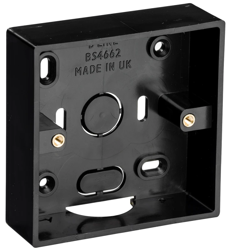 28mm deep 1-gang Surface Box, having 1x unique push-out tab for interface with D-Line 30x15mm Black mini trunking. Malleable ABS – ideal if additional K/O entries are required · · · For surface-mounted 1-gang sockets, switches, TV outlets and data points · · Push-out 30x15mm ½-circle tab, for clean and speedy knock-out · · Can accept D-Line Box Adaptor and Box Adaptor Tee accessories · · Malleable, not brittle · · Easy to drill additional entry points, if required · · Fully safety tested and certified to BS 4662:2006+A1:2009