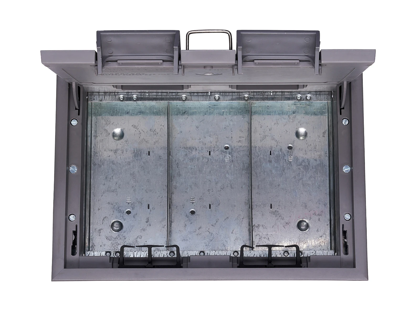 The Grosvenor floorbox has been designed to withstand working loads of the PSA MOB PF2 PS/SPU specification for raised floors. The floorboxes listed within this catalogue are capable of accepting a very wide range of accessories fitted in any compartment. However, certain combinations do impose restrictions on positioning, due to the clashes of connectors, plug tops or the cables themselves. · · · 3 Compartment · · Designed for installation from above the floor panel, all of the access floor boxes in the Grosvenor Fast-Fit range incorporate twin securing clamp mechanisms to simplify installation and reduce on-site cost · · The securing clamps are extremely simple to operate and adjust to suit a range of floor panel and compressed carpet heights from 20 to 50mm · · Standard 87mm depth across range provides a generous accessory plate to lid height