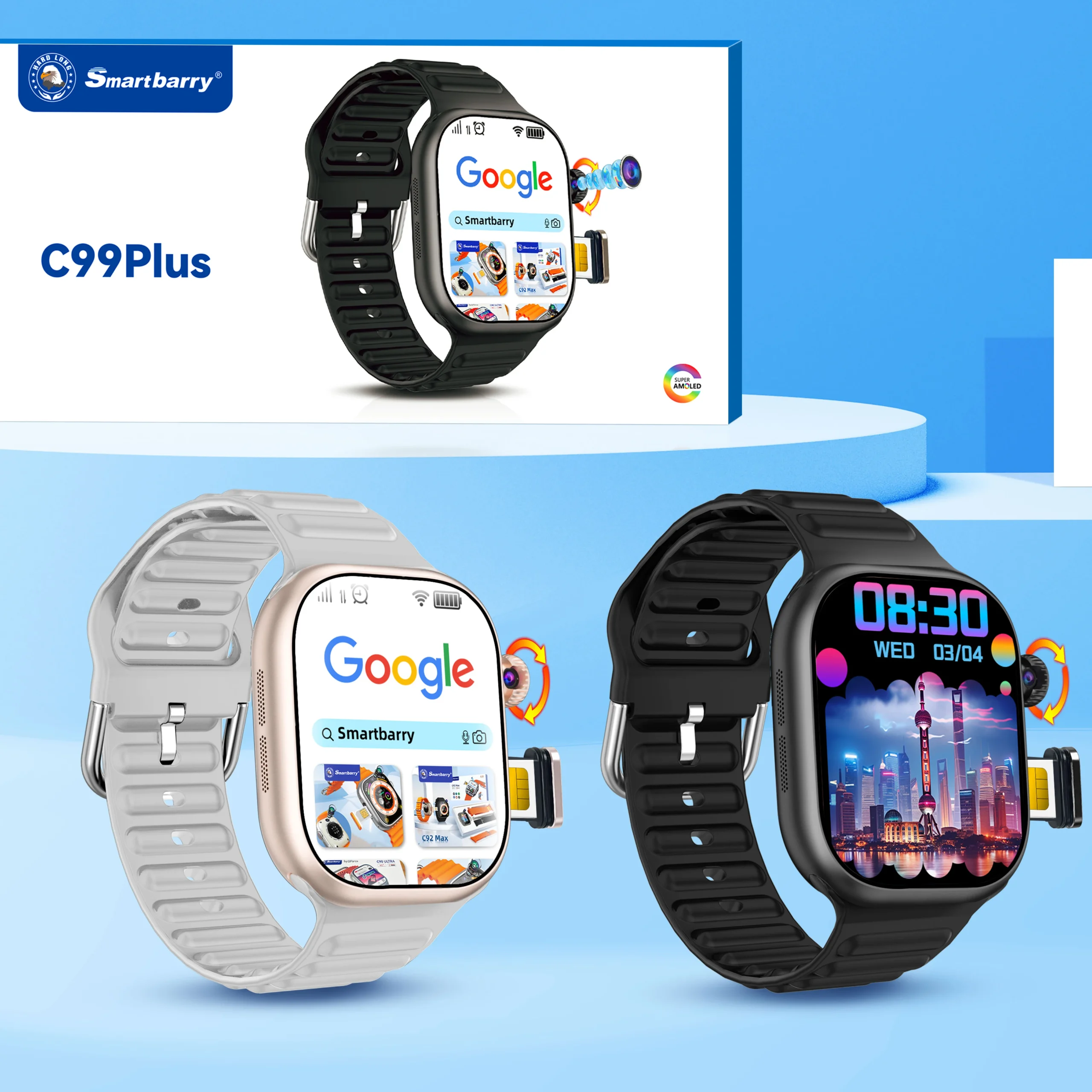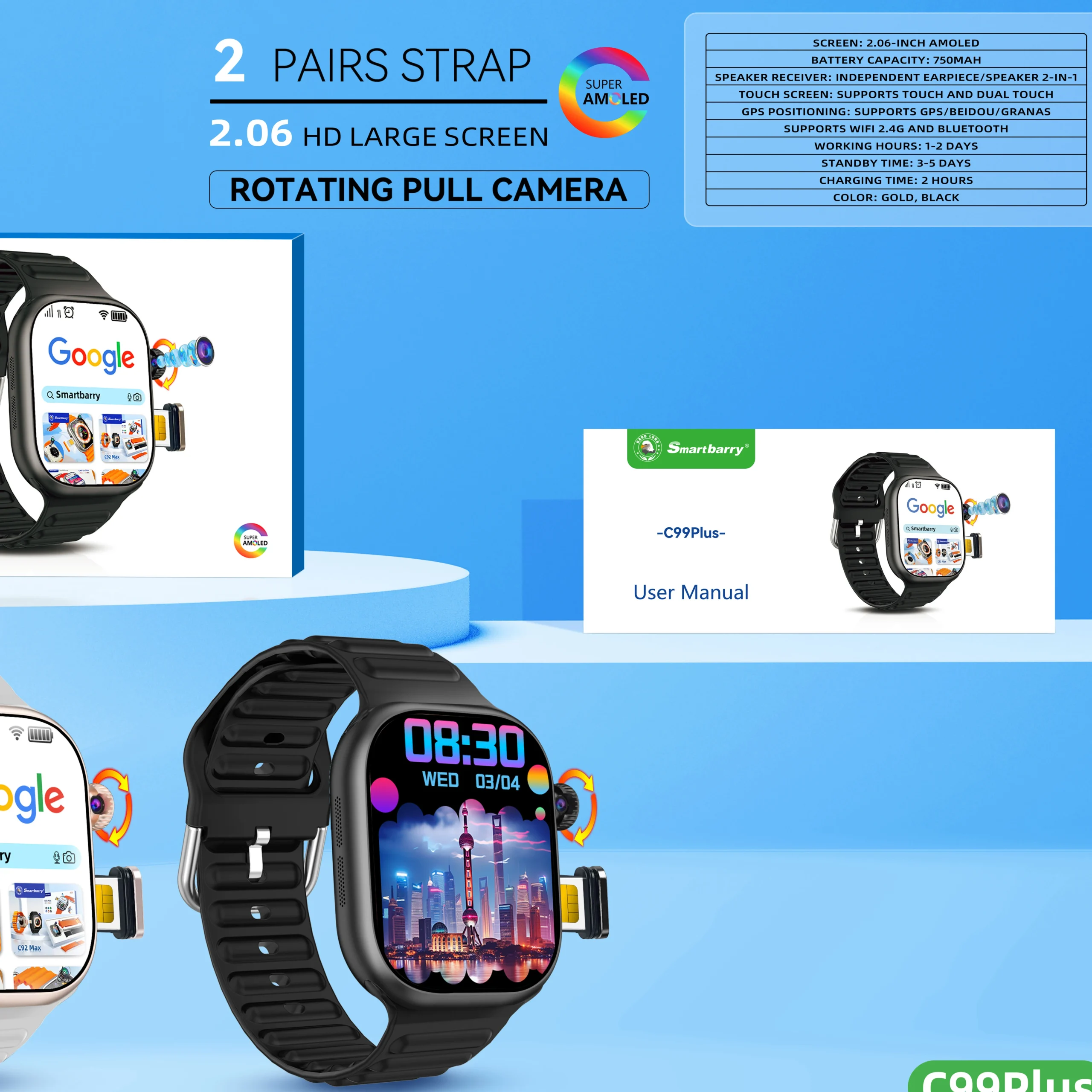 C99 Plus 2.06″ 6+64GB GPS Wifi 3D Rotation Pull Camera Amoled HD Large Display Screen 5G Sim Card Function Smart Watch C99plus