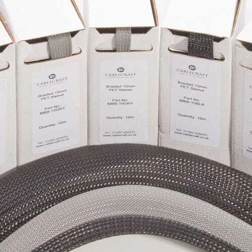 8mm Mini-Box Braided Sleeve Black – 10m. Braided sleeving is lightweight, self-fitting and flexible. It is available in convenient mini packs, suitable for use with cables up to a maximum diameter of 55mm. It provides tough protection for bundles, wires, cables and flexible pipe systems. Ideal for use in automotive, rail traction and rolling stock, aerospace, military vehicles, submarines, ships and data telecommunications. Key Features. Made from heat stabilised polyester. Unaffected by most chemicals. Passes flame requirement of CEI 332-1, FMVSS 302(Type A)12 according to NF F 16-101. Passes CEI 754-1, CE 754/2, Low Smoke, NFC20452 (Polymer). · · · Colour: Black