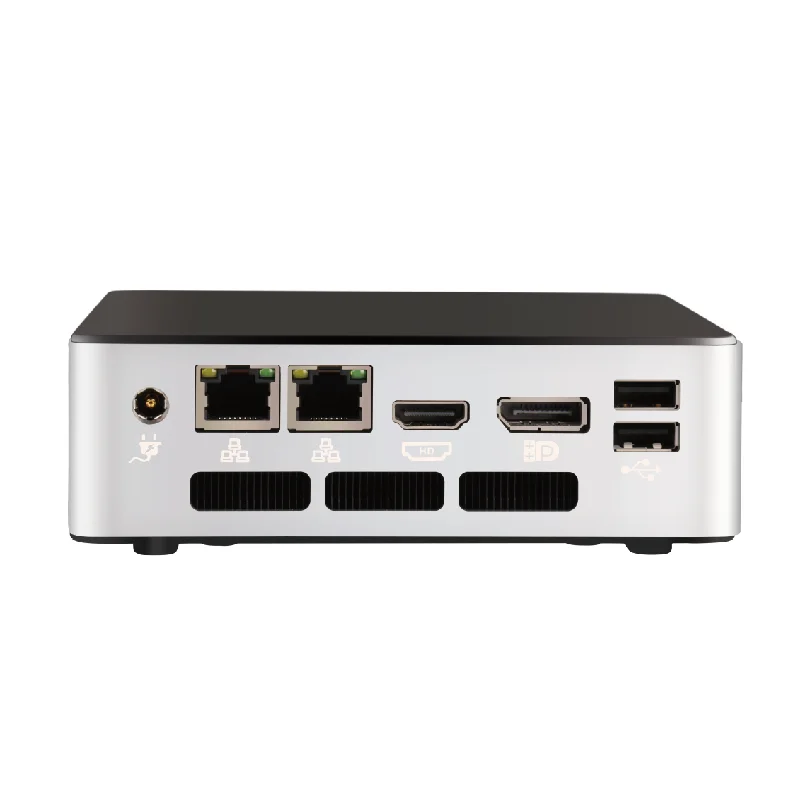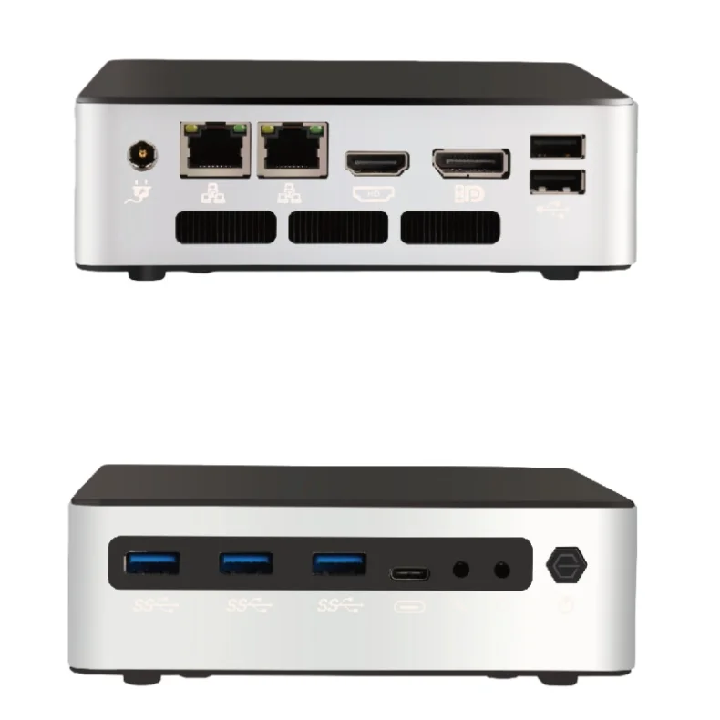 Product Description Specification Processor Intel 12th/13th Generation P/U Series Intel® Core™ Ultra processors (Series 1) Memory DDR5 SODIMM x2, Maximum support for 64GB Display HDMI 2.0+DP+USB TYPE-C display Network 2 x RJ45 Realtek 8111H I/O interface 3 x USB 3.2 Gen2, 2 x USB 2.0, 1 x USB Type-C (supports display) 1 x HDMI 2.0,1 x DP 1.4,1 x USB Type-C 1 x Power Button Supports 12V-19V power input 1 x headphone jack, 1 x microphone Storage 2 x M.2 NVME (with one SSD supporting M.2 SATA) Expansion slot 1 x M.2 WIFI system support Windows 10,Windows 11,Linux Other Network wake-up, incoming call startup, timed startup, no disk startup power input DC12-19V Material Aluminum+ABS Installation method Supports desktop and wall mounting SIZE 135x125x40 mm Weight 1.5KG Storage temperature -30℃ to +70℃ Operating Temperature -20℃ to +60℃ storage humidity 10%~90% @ 30 ℃, no condensation Packing & Delivery To better ensure the safety of your goods, professional, environmentally friendly, convenient and efficient packaging services will be provided.