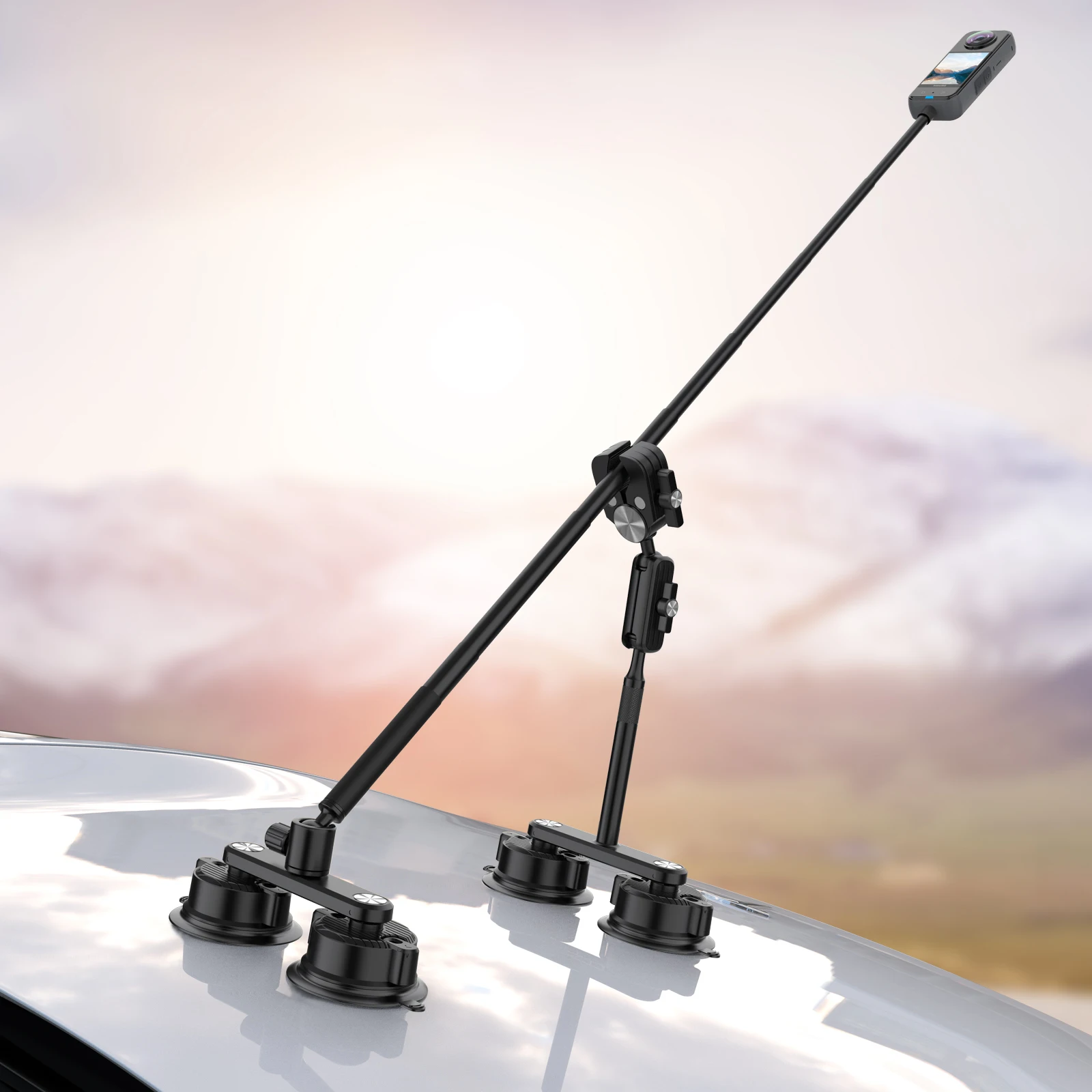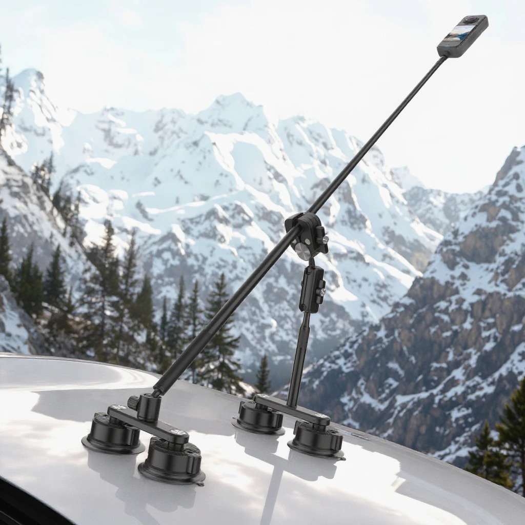 Product Description Product Name Car Suction Cup Holder for Insta360 X4 X3 Car Mount Kit with Invisible Selfie Stick CNC Adapter for GoPro DJI Accessories Material Aluminum Alloy Material Function Adjustable Package Retail box package Product performance description 产品性能介绍说明 【Triple Suction Cup Car Mount Kit】 Capture unique driving angles from your engine hood, windshield, or car side for immersive footage on the road. This suction cup camera mount securely attaches your action camera with three powerful suction cups, and position it using the extension poles and the ball head magic arm for various shooting perspectives. Also includes a lanyard for added safety Product Usage Product usage introduction 产品使用方式介绍 【Aluminum Alloy Material】 【Quick Release Powerful Suction Cups】 Featuring three suction cups , this camera car mount creates a sturdy triangular structure for reliable weight bearing. Presses for quick, powerful grips on the surfaces, aided by the indicator lines, and swift release with a simple upward pull of two buttons on each cup. The dual suction cup mount is connected by a U shaped bracket, allowing both combined and standalone use, catering to diverse shooting needs Description of product use effect 产品使用效果说明 【Action Camera Adapter Included】 The single suction cup mount, telescopic pole, and short extension pole are all equipped with a 1/4″ mounting screw for versatile mounting of mirrorless vlog cameras, camcorders, phone holders, action camera adapters, and more (only the action camera adapter is included). The action camera adapter is compatible with DJI OSMO Action 4 3 2 Hero 12 11 10 9 Insta360 X3 X2, etc.