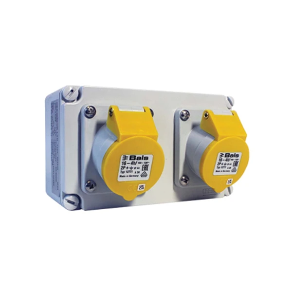 CEENORM 2 gang socket outlet. With 2 x 16A, 110V, 3P, IP44, 4H sockets mounted on a plain sided junction box and comes pre-wired to Terminal Block. · · · Enclosure made of halogen-free plastic material · · IP44 Protection Rated · · All back boxes are supplied undrilled for cable entry unless otherwise requested · · Angled sockets fitted as standard · · Straight sockets can be fitted on special request · · Manufactured by CEENORM using BALS panel sockets