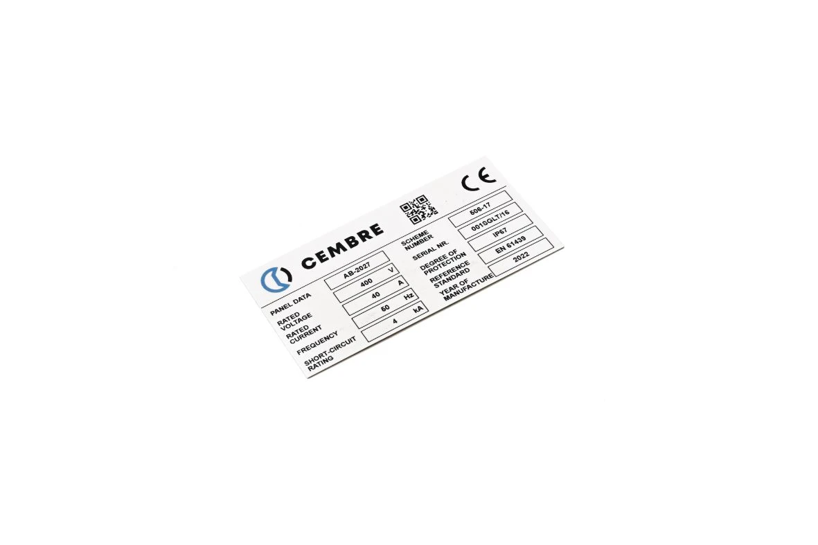 52x107mm White PVC Adhesive Legend · · · Material: Plasticised polyvinyl chloride · · -30°C to +60°C Temperature Range · · Self-extingushing Class V0 (UL 94) · · Silicon Free · · Material: Flat – 0,5mm · · Approved UL 969 CSA C22.2 No.0.15
