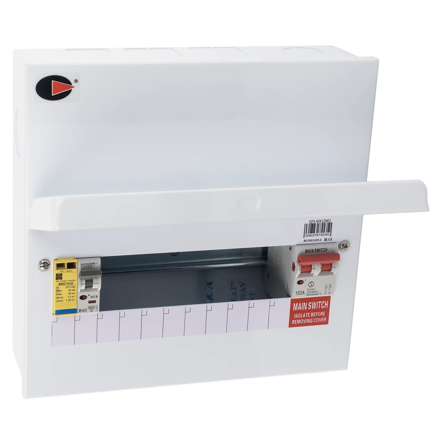 12 way metal clad consumer unit prefitted with 100A main switch and Type 2 surge protection that gives 9 useable ways. Incorporates rectangular knockouts for use with 25x40mm and 50x50mm mini trunking along with 32mm & 40mm diameter round knockouts for conduit, grommets and cable glands. This consumer unit is fully compliant with BSEN61439-3:2012 and Amendment 2 of the 18th Edition of the IET Wiring Regulations – BS7671 · · · 12 Modules with 9 useable ways · · 100A main switch fitted · · Type 2 surge protection fitted · · Square knockouts · · Dimensions: H:266 x W:281 x D106mm · · Rated operating voltage: 230V
