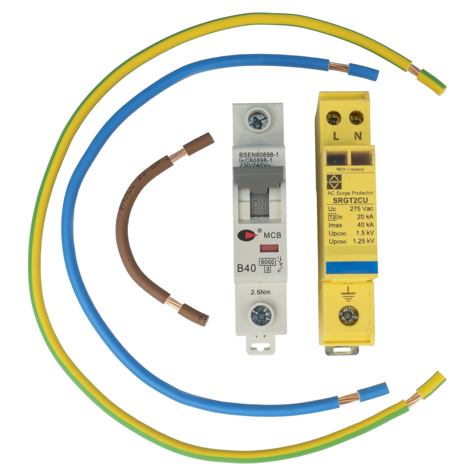Surge Protection Device (SPD) is designed and is tested for use with CGD distribution boards. Easily add surge protection to existing boards with this retrofit surge protection kit, containing SPD, cables and 40A MCB. · · · Surge Protective Class: Type 2 · · Phase: 1 · · Modules: 2 · · Din rail mounted · · MCB: 40A · · Frequency: 50/60Hz