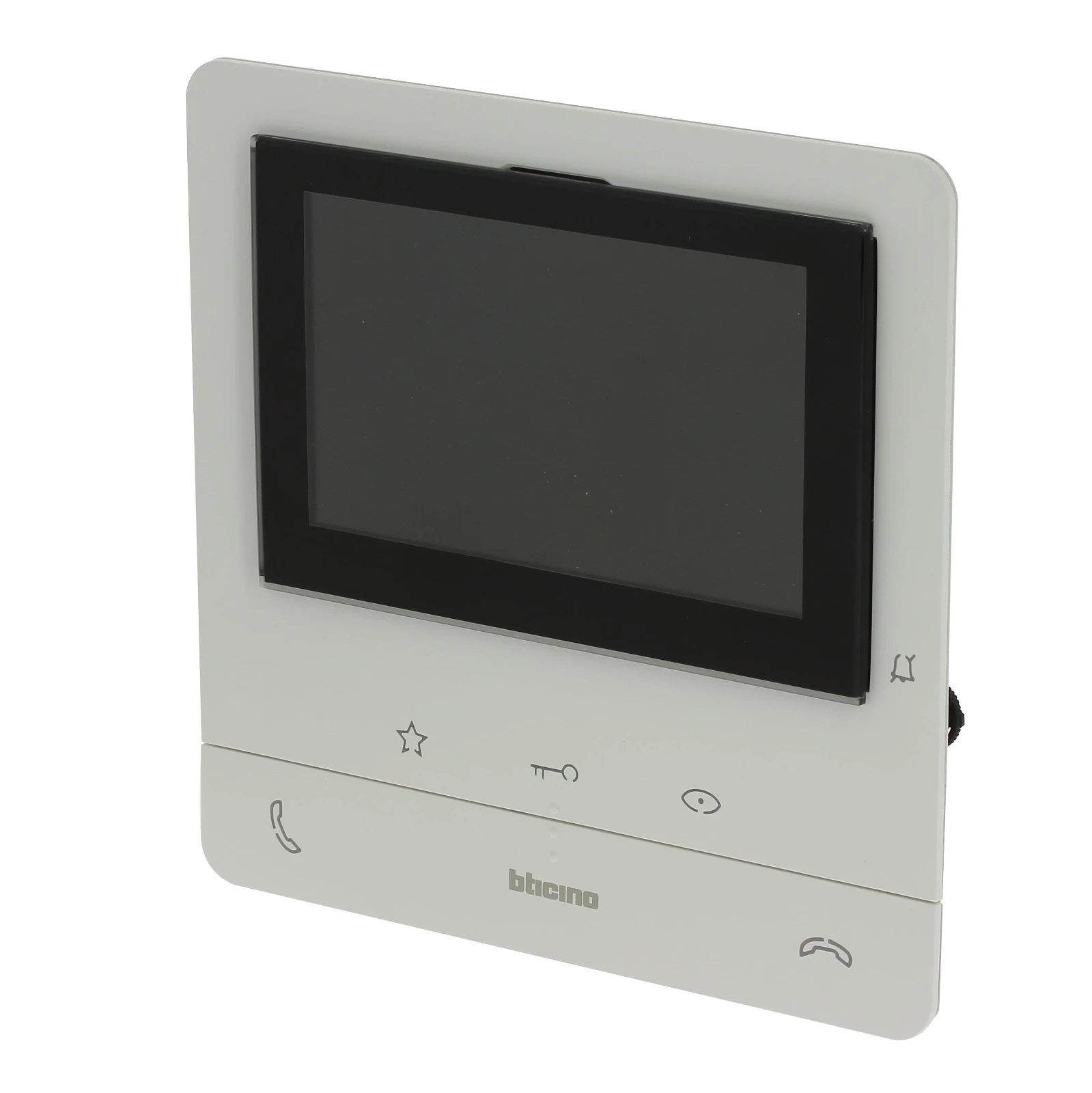 Classe 100 2 wires handsfree video internal unit with 5 inch colour LCD display. The device has 2 physical keys for the control of the main video door entry functions – answer and end a call – and 3 touch keys that allow the door lock release, the entrance panel activation/scrolling and the customisation of a most frequently used quick action – e.g. staircase light control, intercom, additional door lock activation, generic activations. The device has a side lever to adjust: colour, brightness and display contrast, audio and call tone volume. There is a call exclusion notification LED. The installation can be made to the wall using the bracket supplied or using table support accessories (2 x 344692) – to be purchased separately. The device must be configured. · · · Power supply 18 – 27 Vdc · · Stand by absorption 10 mA · · Max. absorption 250 mA max · · Maximum cable section for each clamp 2 x 1 mm · · Can be wall mounted using bracket (supplied)