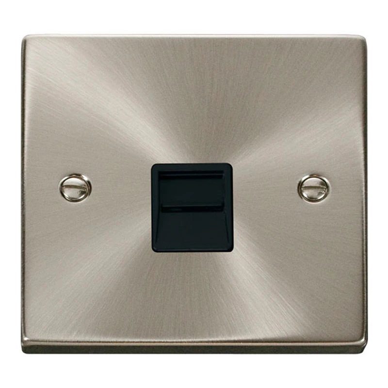 Scolmore Deco telephone outlet with satin chrome finish. The smooth modern lines of the Deco accessory plate will fit easily into traditional and contemporary designs alike. This Telephone Outlet is designed to fit effortlessly with the range. · · · Secondary outlet · · Single socket · · Terminal Size IDC · · Shielded No · · Plate Fixing Centres 60.3mm · · Back Box Depth 16mm Minimum · · Operational Temperature -5C to +40C · · IP20 · · Insert & Gasket Colour Black