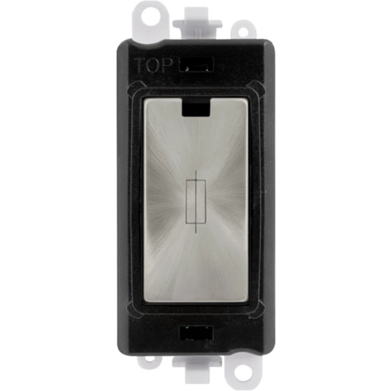 Gridpro black frame 13A satin chrome fused connection module. · · · Dimensions 24.5mm (W) x 50mm (H) x 22.5mm (D) · · Aperture Dimensions 20mm (W) x 35mm (H) · · Module Frame Finish Black · · Module Finish Satin Chrome · · Body & Insert: Nylon · · Maximum Voltage 250V 50Hz · · Load Rating 13A · · Terminal Size 5mm · · Termination Type Screw · · Terminal Torque 1.2Nm