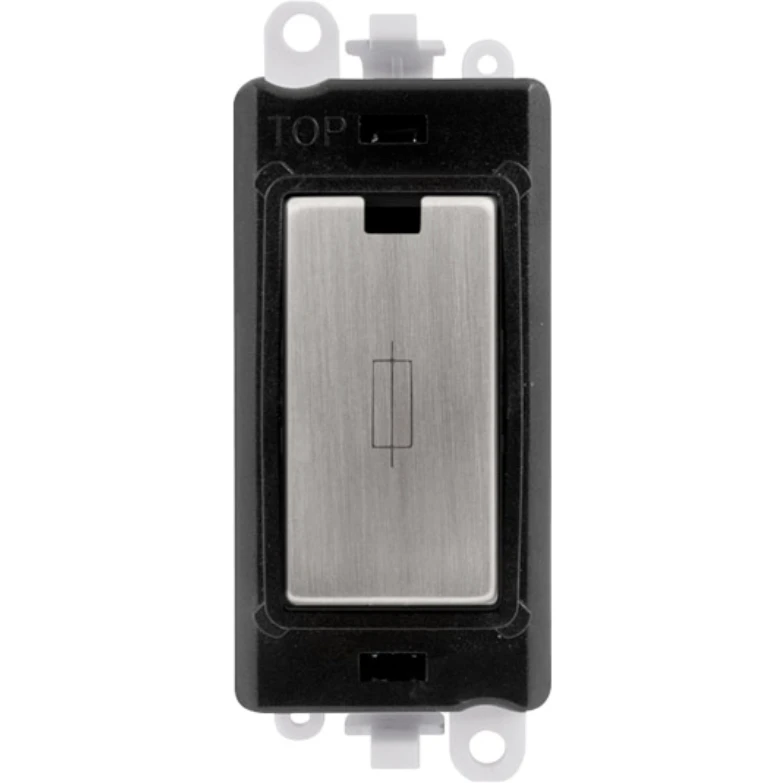 Gridpro black frame 13A stainless steel fused connection module. · · · Dimensions 24.5mm (W) x 50mm (H) x 22.5mm (D) · · Aperture Dimensions 20mm (W) x 35mm (H) · · Module Frame Finish Black · · Module Finish Stainless Steel · · Body & Insert: Nylon · · Maximum Voltage 250V 50Hz · · Load Rating 13A · · Terminal Size 5mm · · Termination Type Screw · · Terminal Torque 1.2Nm