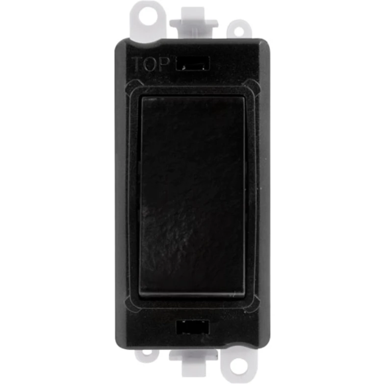 Gridpro black frame 20AX black intermediate switch module. · · · Dimensions 24.5mm (W) x 50mm (H) x 22.5mm (D) · · Aperture Dimensions 20mm (W) x 35mm (H) · · Module Frame Finish Black · · Switch Finish Black · · Body & Insert: Nylon · · Maximum Voltage 250V 50Hz · · Load Rating 20AX (Suitable For Inductive Loads) · · Terminal Size 5mm · · Termination Type Screw · · Terminal Torque 1.2Nm