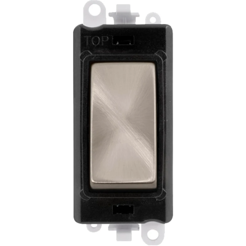Gridpro black frame brushed stainless switch 20AX 2 way module. · · · Dimensions 24.5mm (W) x 50mm (H) x 22.5mm (D) · · Aperture Dimensions 20mm (W) x 35mm (H) · · Module Frame Finish Black · · Switch Finish Brushed Stainless · · Body & Insert: Nylon · · Maximum Voltage 250V 50Hz · · Load Rating 20AX (Suitable For Inductive Loads) · · Terminal Size 5mm · · Termination Type Screw · · Terminal Torque 1.2Nm