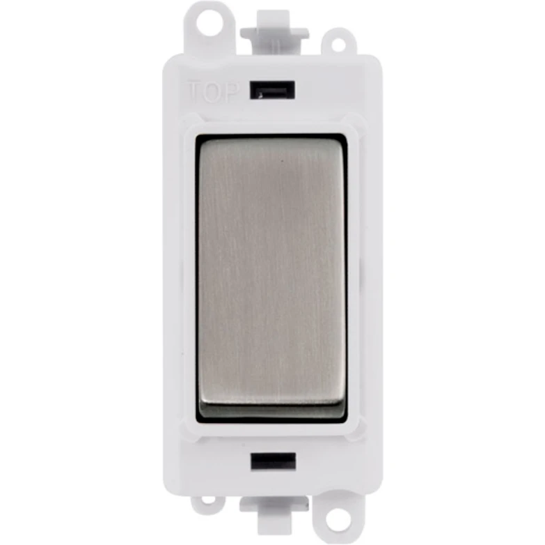 Gridpro polar white frame 20AX stainless steel double pole switch module. · · · Dimensions 24.5mm (W) x 50mm (H) x 22.5mm (D) · · Aperture Dimensions 20mm (W) x 35mm (H) · · Module Frame Finish Polar White · · Switch Finish Stainless Steel · · Body & Insert: Nylon · · Maximum Voltage 250V 50Hz · · Load Rating 20AX (Suitable For Inductive Loads) · · Terminal Size 5mm · · Termination Type Screw · · Terminal Torque 1.2Nm