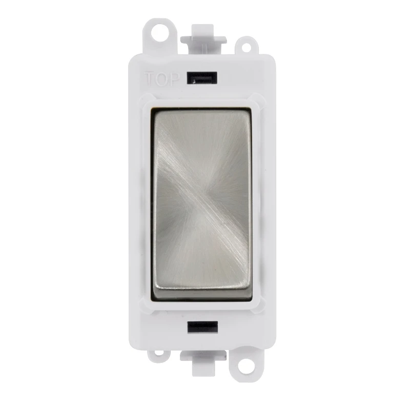 Scolmore GridPro Switch Module with satin chrome finish. GridPro module available in eleven distinctive, quality finishes, with black or white inserts, excluding antique brass and black nickel finishes. The GridPro module rocker is styled to match the existing range of Click wiring accessories to complement any existing Click installation. A simple code structure signifies the module colour and product finish. · · · Satin chrome finish · · 20A current rating · · 10 year warranty · · IP20 protection rating