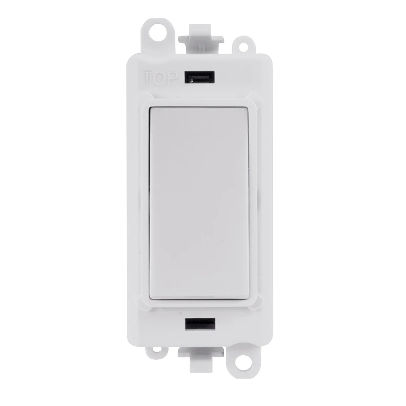 Scolmore GridPro Switch Module with polar white finish. GridPro module available in eleven distinctive, quality finishes, with black or white inserts, excluding antique brass and black nickel finishes. The GridPro module rocker is styled to match the existing range of Click wiring accessories to complement any existing Click installation. A simple code structure signifies the module colour and product finish. · · · Polar white finish · · 20A current rating · · 10 year warranty · · IP20 protection rating