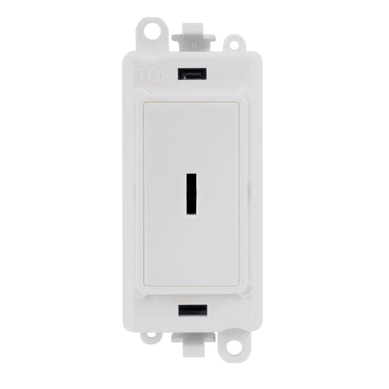 Scolmore GridPro Keyswitch Module with polar white finish. GridPro modules featured in this brochure are available in eleven distinctive, quality finishes, with black or white inserts, excluding antique brass and black nickel finishes, which are available with black inserts only. A simple code structure signifies the module colour and product finish. · · · Polar white finish · · 20A current rating · · BS EN 60669-1 standards