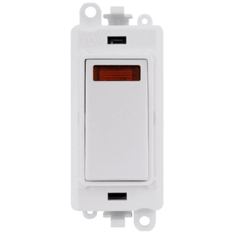 Scolmore International GM2018NPW GridPro Switch DP Module c/w Neon – White Insert 20AX · · · Product: Switch Module · · Type: Grid · · Switched/Unswitched: Switched · · Gangs: 1 Gang · · Ways: 1 Way · · Includes 13A Switch Socket?: N · · Includes RCD?: N · · Neon Indicator: Y · · Pole Configuration: Double Pole (2P) · · Flex Outlet: N