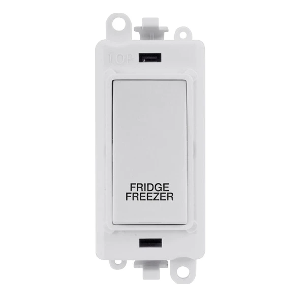 Scolmore GridPro Switch Module with fridge freezer marking. GridPro module available in eleven distinctive, quality finishes, with black or white inserts, excluding antique brass and black nickel finishes. The GridPro module rocker is styled to match the existing range of Click wiring accessories to complement any existing Click installation. A simple code structure signifies the module colour and product finish. · · · Polar white finish · · 20A current rating · · 10 year warranty · · IP20 protection rating