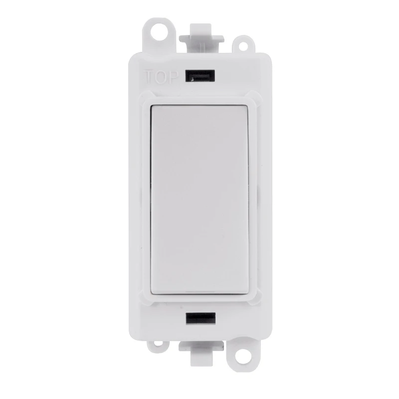 Scolmore GridPro Intermediate Switch Module with polar white finish. GridPro module available in eleven distinctive, quality finishes, with black or white inserts, excluding antique brass and black nickel finishes. The GridPro module rocker is styled to match the existing range of Click wiring accessories to complement any existing Click installation. A simple code structure signifies the module colour and product finish. · · · Polar white finish · · 20A current rating · · BS EN 60669-1 standards