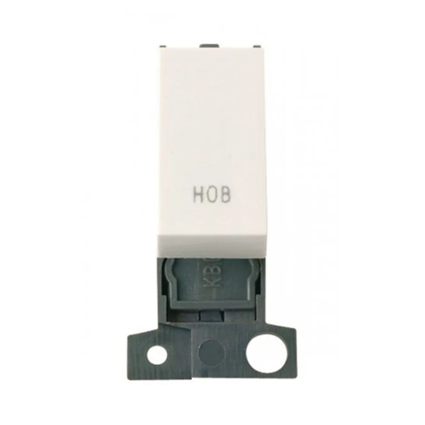 Scolmore MiniGrid Switch Module with polar white finish and hob marking. This MiniGrid module is easily and quickly exchanged or mounted onto unfurnished plates by means of a simple single screw fixing. · · · Polar white finish · · 13A current rating · · BS EN 60669-1 standards