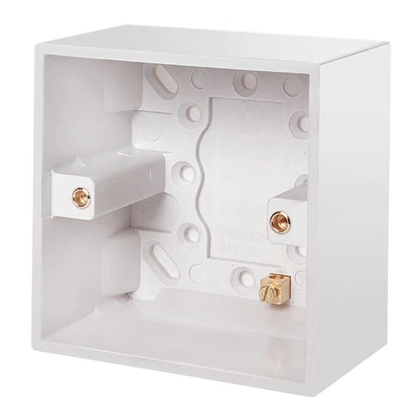 Technical Specifications Technical Specifications Surface mounted box for wiring accessories Colour White Material Plastic Width 87 mm Number of module spaces (modular system) 2 Height of device 87 mm Width of device 87 mm Depth of device 52 mm Height 87 mm Number of units/gangs 1 Halogen free No Shock resistant No Suitable for modular domestic switching devices No With cable entry/outlet No Transparent No With trunking entry No Breakaway box for trunking mounting No With screw gland entry No · Technical Data Sheet – Click to Download