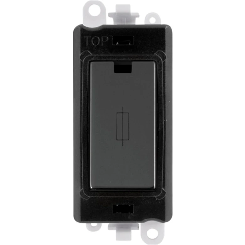 Gridpro black frame 13A black nickel fused connection module. · · · Dimensions 24.5mm (W) x 50mm (H) x 22.5mm (D) · · Aperture Dimensions 20mm (W) x 35mm (H) · · Module Frame Finish Black · · Module Finish Black Nickel · · Body & Insert: Nylon · · Maximum Voltage 250V 50Hz · · Load Rating 13A · · Terminal Size 5mm · · Termination Type Screw · · Terminal Torque 1.2Nm