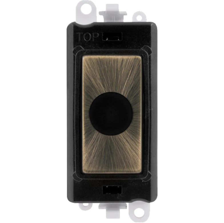 Gridpro polar white frame 20A antique brass flex outlet module. · · · Dimensions 24.5mm (W) x 50mm (H) x 22.5mm (D) · · Aperture Dimensions 20mm (W) x 35mm (H) · · Module Frame Finish Black · · Module Finish Antique Brass · · Body & Insert: Nylon · · Maximum Voltage 250V 50Hz · · Load Rating 20A · · Terminal Size 5mm · · Terminal Torque 1.2Nm · · Terminal Capacity 3 x 2.5mm