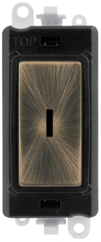 Gridpro black frame 20AX 2 way antique brass keyswitch module. · · · Dimensions 24.5mm (W) x 50mm (H) x 22.5mm (D) · · Aperture Dimensions 20mm (W) x 35mm (H) · · Module Frame Finish Black · · Module Finish Black · · Body & Insert: Nylon · · Maximum Voltage 250V 50Hz · · Load Rating 20AX (Suitable For Inductive Loads) · · Terminal Size 5mm · · Termination Type Screw · · Terminal Torque 1.2Nm