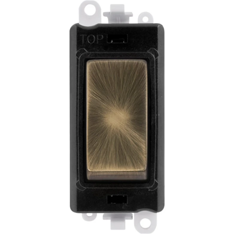 Gridpro black frame 20AX antique brass 3 position centre ‘Off’ retractive switch module. · · · Dimensions 24.5mm (W) x 50mm (H) x 22.5mm (D) · · Aperture Dimensions 20mm (W) x 35mm (H) · · Module Frame Finish Black · · Switch Finish Antique Brass · · Body & Insert: Nylon · · Maximum Voltage 250V 50Hz · · Load Rating 20AX (Suitable For Inductive Loads) · · Terminal Size 5mm · · Termination Type Screw · · Terminal Torque 1.2Nm