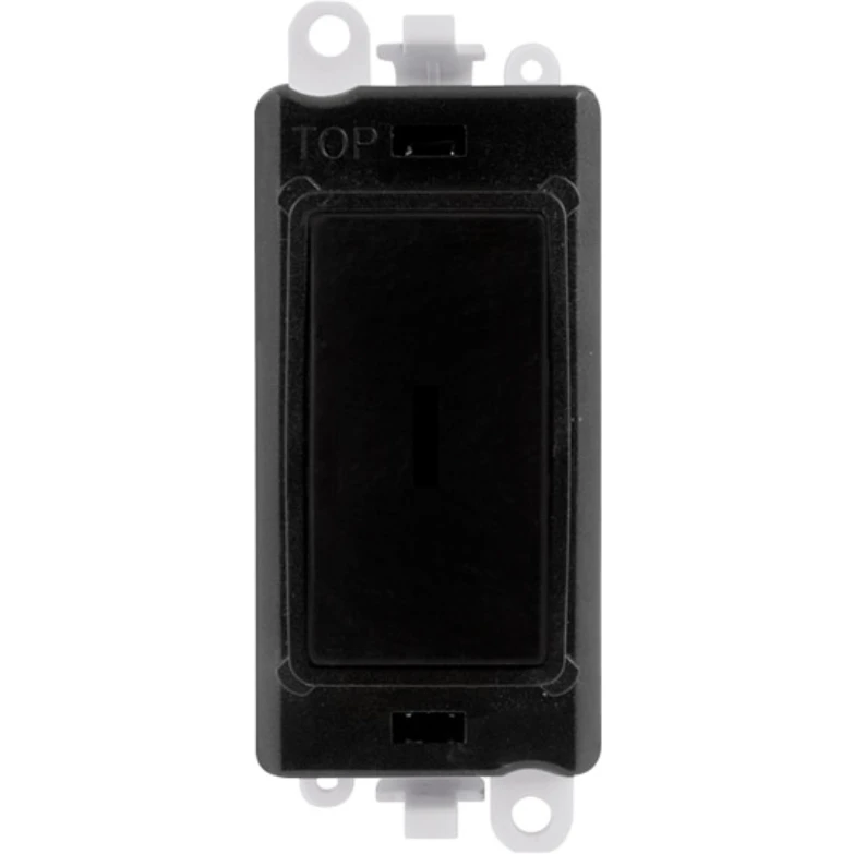 Gridpro black frame 20AX black double pole keyswitch module. · · · Dimensions 24.5mm (W) x 50mm (H) x 22.5mm (D) · · Aperture Dimensions 20mm (W) x 35mm (H) · · Module Frame Finish Black · · Module Finish Black · · Body & Insert: Nylon · · Maximum Voltage 250V 50Hz · · Load Rating 20AX (Suitable For Inductive Loads) · · Terminal Size 5mm · · Termination Type Screw · · Terminal Torque 1.2Nm