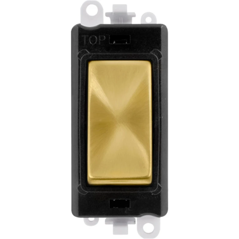 Gridpro black frame 20AX satin brass 3 position centre ‘Off’ retractive switch module. · · · Dimensions 24.5mm (W) x 50mm (H) x 22.5mm (D) · · Aperture Dimensions 20mm (W) x 35mm (H) · · Module Frame Finish Black · · Switch Finish Satin Brass · · Body & Insert: Nylon · · Maximum Voltage 250V 50Hz · · Load Rating 20AX (Suitable For Inductive Loads) · · Terminal Size 5mm · · Termination Type Screw · · Terminal Torque 1.2Nm