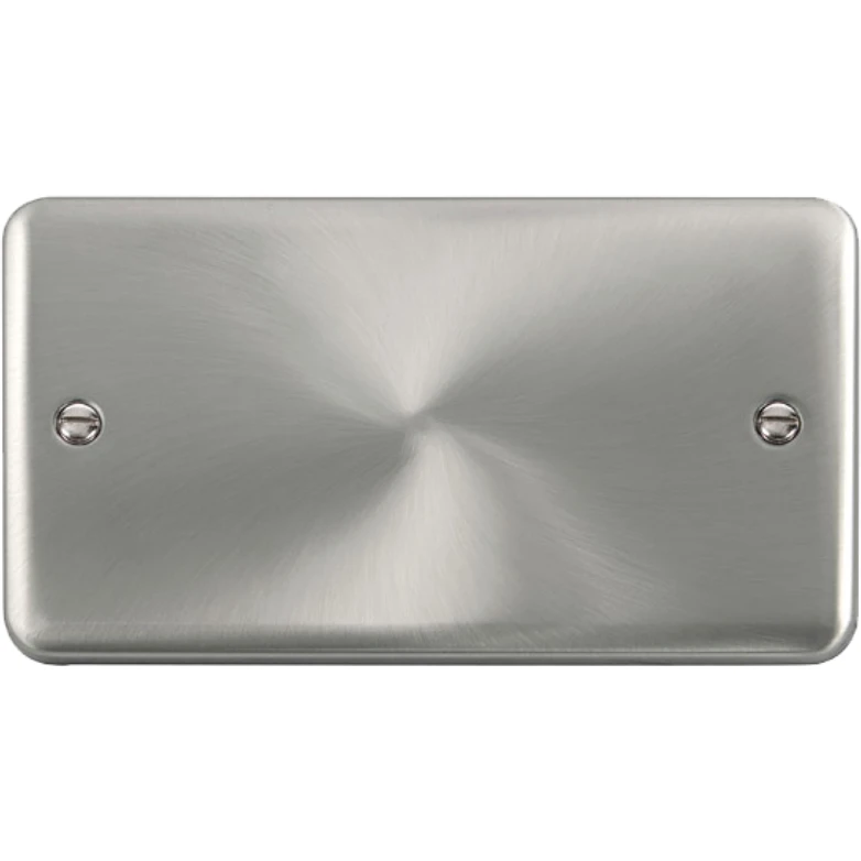 Deco plus rounded profile satin chrome 2 gang blank plate. · · · Dimensions 146mm (W) x 88mm (H) x 8mm (D) · · Plate Design & Finish Rounded Profile Satin Chrome · · Gasket Colour Supplied With Both Black & White Gasket · · Front Plate: Stainless Steel · · Plate Fixing Centres 120.6mm · · Ingress Protection IP20 · · Back Box Depth 16mm Minimum · · Operational Temperature -5°C to +40°C · · Warranty 10 Years