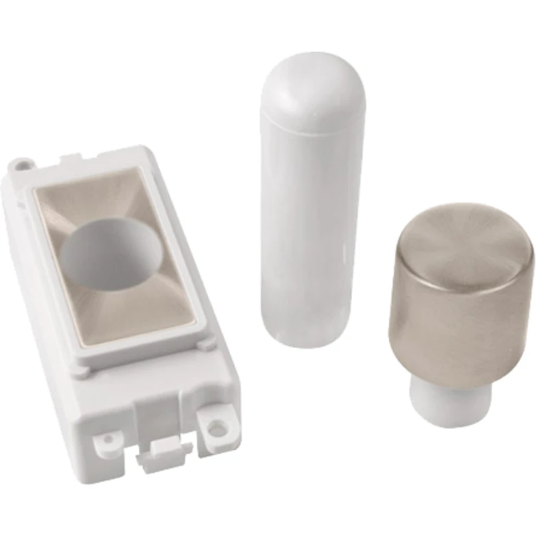 Gridpro polar white module frame brushed stainless 1 module dimmer mounting kit. · · · Dimensions 24.5mm (W) x 50mm (H) · · Aperture Dimensions 20mm (W) x 35mm (H) · · Module Frame Finish Polar White · · Module & Control Button Finish Brushed Stainless · · Body & Insert: Nylon · · Plate Fixing Centres 60.3mm · · Back Box Depth 47mm · · Operational Temperature -5°C to +40°C · · Warranty 10 Years