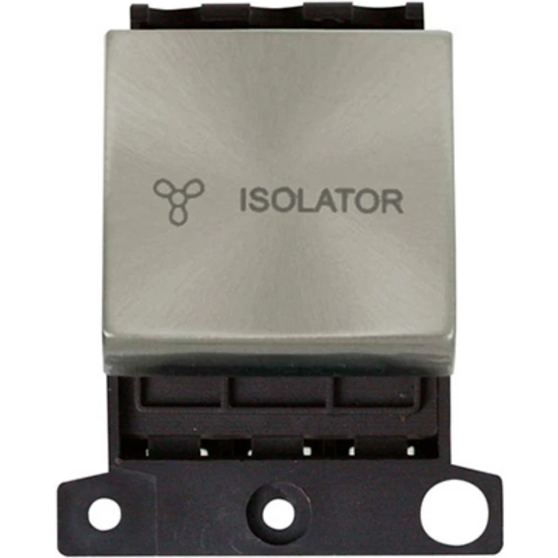 Minigrid brushed stainless 10A 3 pole fan isolation switch module. · · · Dimensions 41mm (W) x 52.5mm (H) x 22mm (D) · · Aperture Dimensions 32mm (W) x 31.5mm (H) · · Finish Brushed Stainless · · Rocker Switch: Urea · · Rear Housing: Nylon · · Maximum Voltage 250V 50Hz · · Load Rating 13A/10AX (Suitable For Inductive Loads) · · Terminal Size 3.5mm · · Terminal Torque 0.4Nm · · Terminal Capacity 4 x 1.5mm