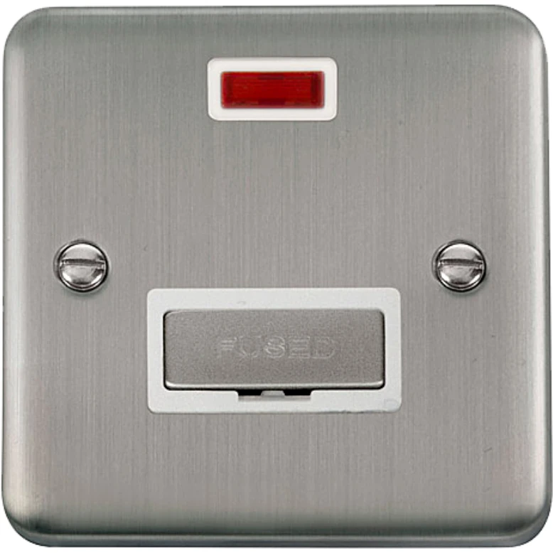 Deco plus rounded profile stainless steel white insert 13A ingot fused connection unit with neon. · · · Dimensions 88mm (W) x 88mm (H) x 8mm (D) · · Plate Design & Finish Rounded Profile Stainless Steel · · Insert & Gasket Colour White · · Front Plate: Stainless Steel · · Insert & Housing: Urea · · Maximum Voltage 250V · · Load Rating 13A · · Plate Fixing Centres 60.3mm · · Terminal Size 5mm · · Terminal Torque 2.5Nm