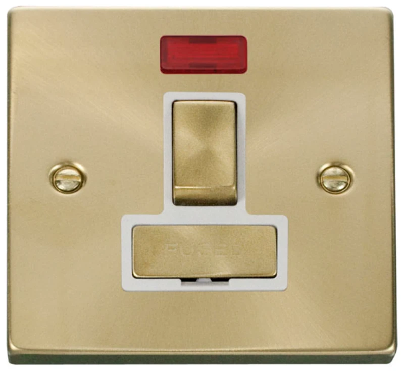 Click Deco VPSB752WH Victorian Satin Brass 13A Fused Ingot Switched Connection Unit With Neon with White Insert · · · Satin Brass Finish with White Trim · · Switched Fused Spur with Neon · · Ingot Switches (switch rocker is the same as the plate finish) · · Suitable for 25mm back box minimum · · Decorative Metal Finish · · Fuse Fitted 13A (BS 1362) · · Ingress Protection IP20