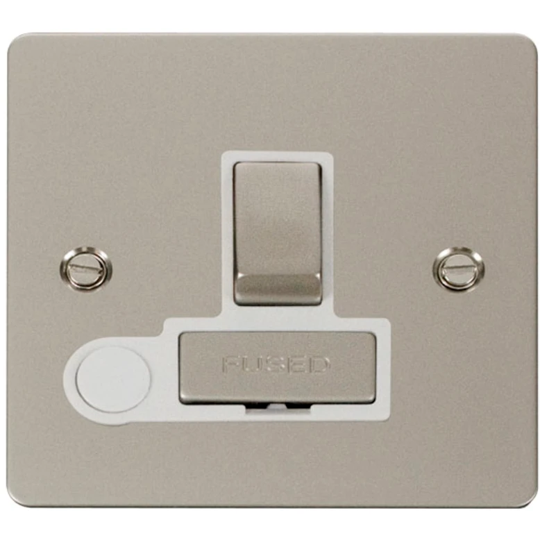 Define flat plate white insert pearl nickel 13A ingot double pole switched fused connection unit with optional flex outlet. · · · Plate Dimensions (mm) 86 (W) x 86 (H) x 1.3 (D) · · Plate Fixing Centres – Horizontal (mm) 60.3 · · Style Flat Plate · · Finish Pearl Nickel · · Insert Colour White · · Gasket Colour Transparent (Neoprene) · · Front Plate: Stainless Steel · · Anti Microbial Certified No · · Rated Voltage (V) (Ue) 250 · · Resistive Load Rating (A) 13