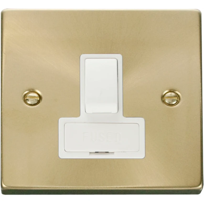 Scolmore International VPSB651WH Deco Connection Unit Switched Fused 13A Satin Brass White Insert Victorian · · · Product: Connection Unit · · Type: Fused · · Qualifier: Low Voltage · · Switched/Unswitched: Switched · · Gangs: 1 Gang · · Includes 13A Switch Socket?: Y · · Pole Configuration: DP · · Fuse Fitted: Y · · Ingress Protection: IP20 · · Body Material: Steel