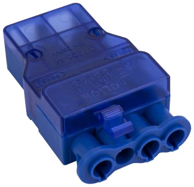Male 4 Pole Push Fit Click Flow Connector 20A · · · 20 Amp 4-Pin splitter (1 In, 2 Out) · · Slimline design for compatibility with CT1016 & CR1008 · · Easy lock & release mechanism · · Versatile, easy-connection system · · IP20 Rated