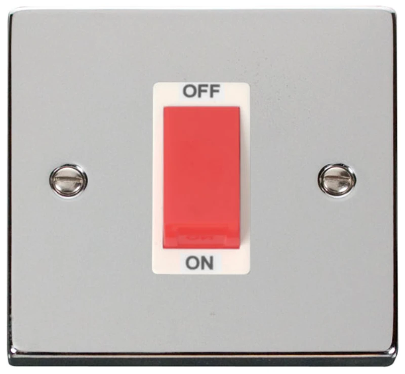 VPCH2000WH 45A Polished Chrome Cooker Control Switch, 1 Gang, White Insert Victorian · · · 45A · · Polished chrome · · Front Plate: Stainless Steel Insert, Switch & Rear Housing: Urea Terminals: Brass Terminal Screws: Steel & Yellow Passivated Contacts: Silver “on-lay Copper / Brass Internal Busbars: Formed Pressed Brass Earth Strap: Mild Steel Gasket: Nylon · · Maximum Voltage 250V~ 50Hz · · Plate Fixing Centres 60.3mm · · Terminal Capacity 1 x 16mm2 · · IP20 · · 10 year warranty · · BS EN 60669-1:1999 +A1:2002 +A2:2008 · · Back Box Depth 35mm Minimum
